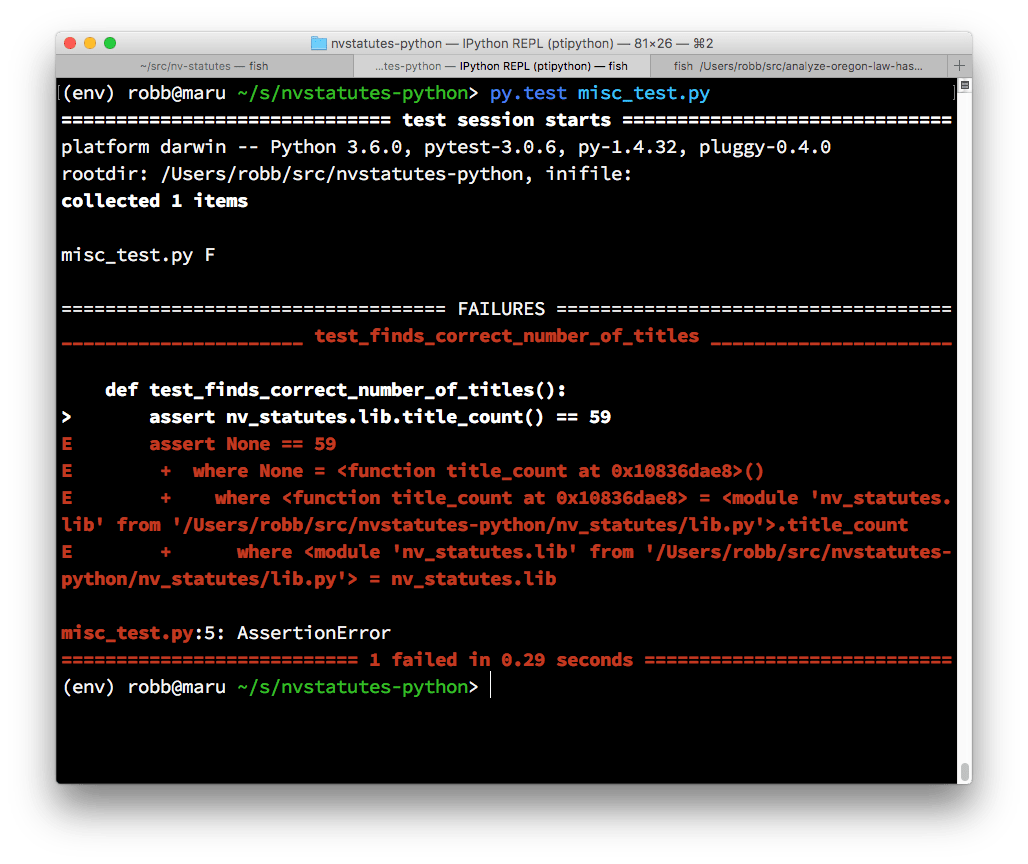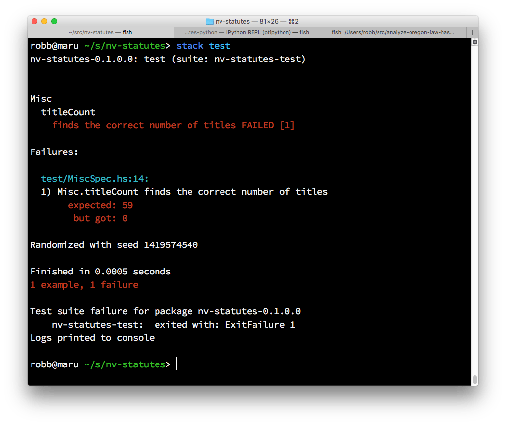 The screenshots above show the results of running my first failing test in each language — failing for pretty much the same reason in each case. My first test is, parse the NRS index page and return the number of Titles found. Python’s pytest puts a lot of junk on the screen in comparison to Haskell’s hspec. Reading the hspec output is a thing of beauty, really.